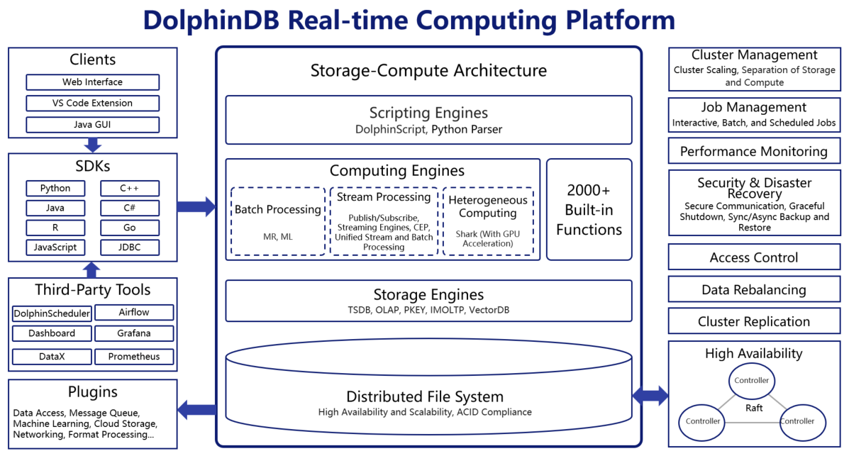 • Various Plugins: DolphinDB supports plugins across different fields, covering data access, financial scenarios, message queues, numerical computing, machine learning, networking, cloud storage, format conversion, etc.
