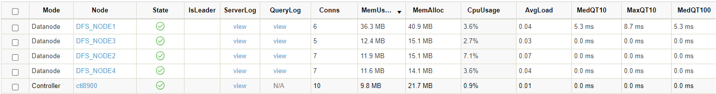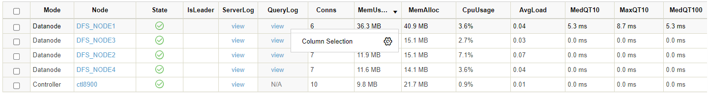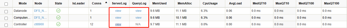 To check the ServerLog or QueryLog of a particular node, click view in these 2 columns.