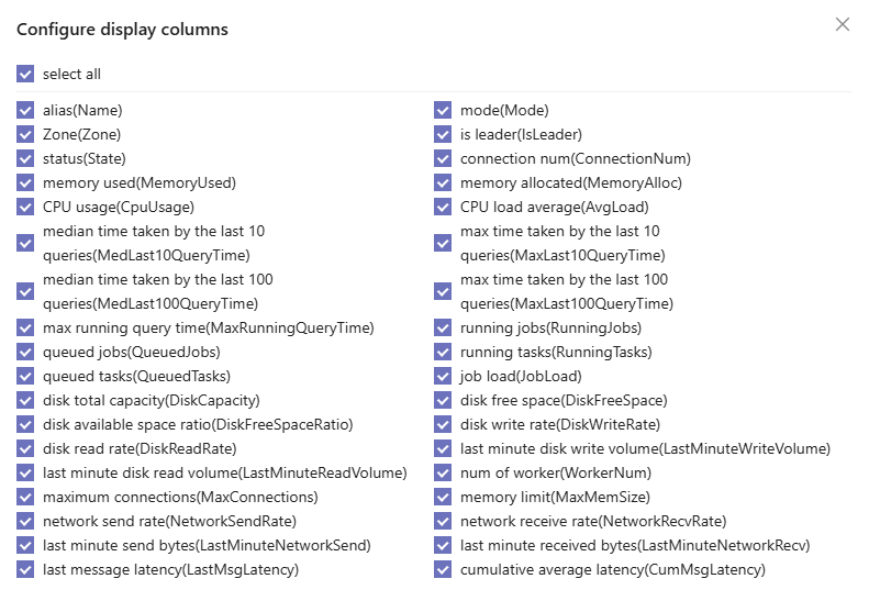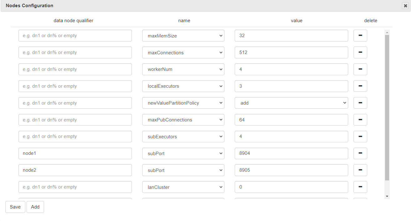 Click Nodes Config to view, add, modify or delete the configuration parameters, which is equivalent to modifying the cluster.cfg file.