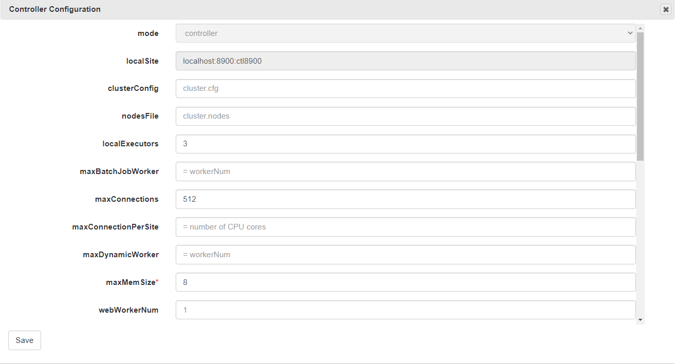 Click Controller Config to view and modify the configuration parameters for the controller, which is equivalent to modifying the controller.cfg file. Note the configuration takes effect only after the controller is rebooted.