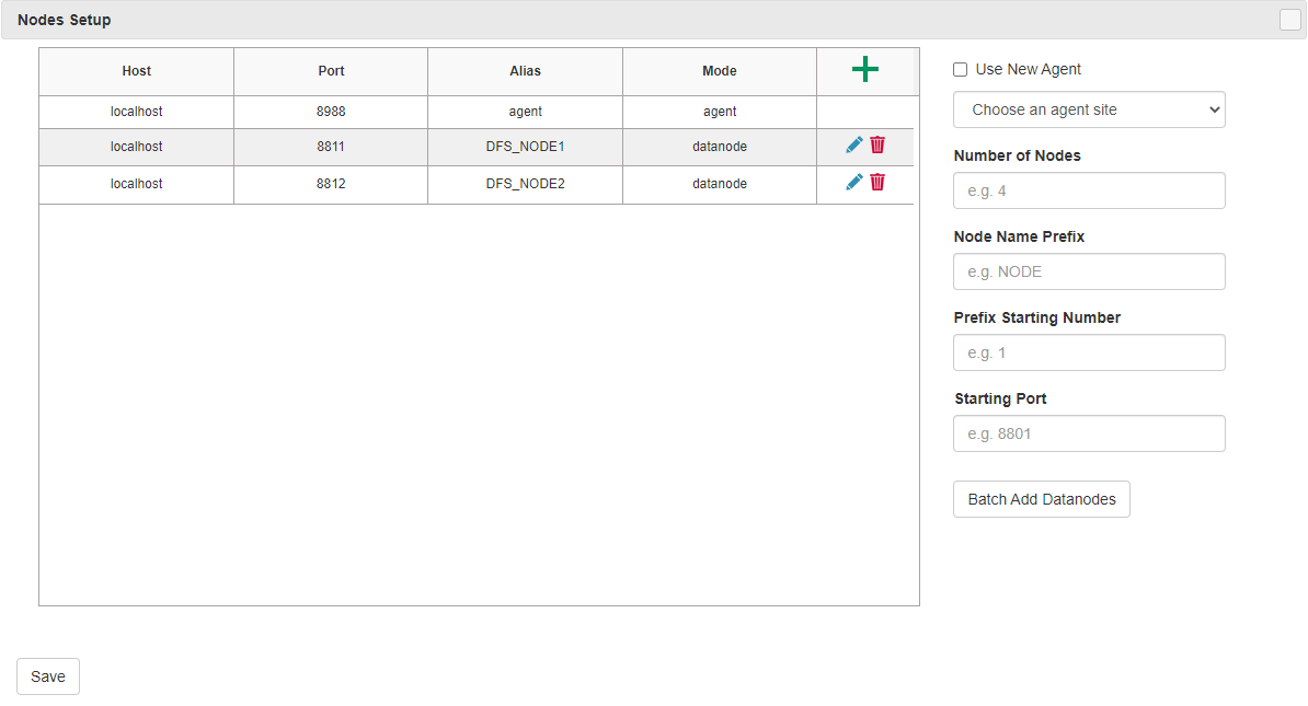 Click Nodes Setup to check the cluster environment. You can add, delete or edit data nodes, which is equivalent to modifying the cluster.nodes file.