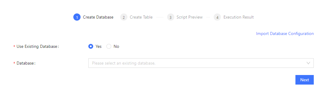 • Using Existing Database: Select the database name from the dropdown list and click Next to proceed to the Create Table page. Alternatively, you can click Import Database Configuration in the top right corner to fill in the page by importing a database configuration file.