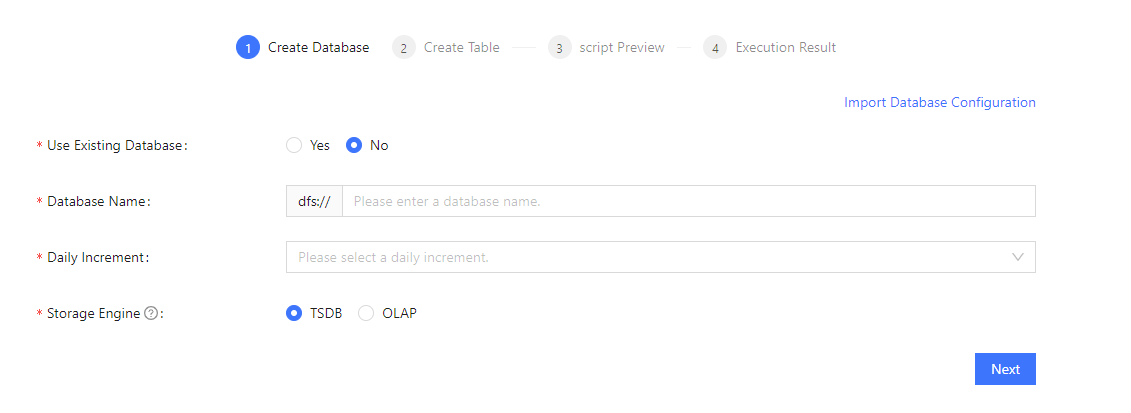 • Creating New Database: First, enter the Database Name. Then, select Daily Increment based on the daily data volume, and finally choose the Storage Engine. After completing these steps, click Next to proceed to the Create Table page. Alternatively, you can click Import Database Configuration in the top right corner to fill in the page by importing a database configuration file.