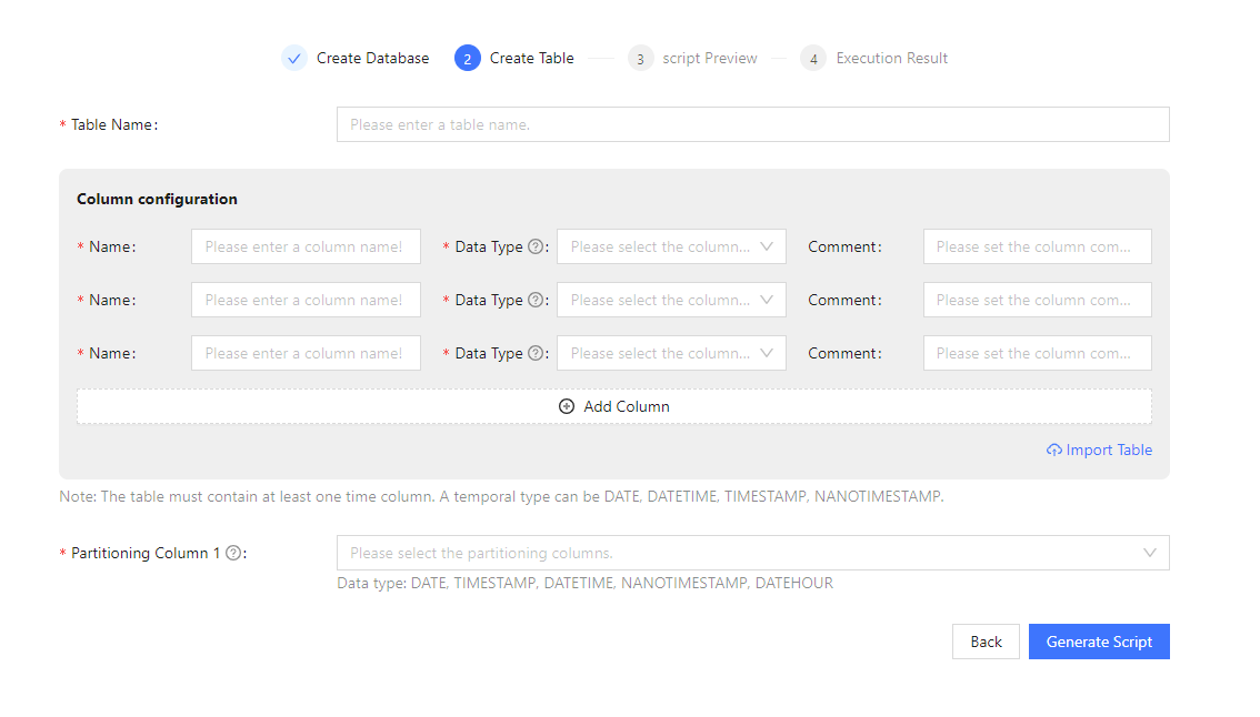 On this page, users can fill in the relevant information to generate the table creation script. Currently, there are two methods to fill in the information: