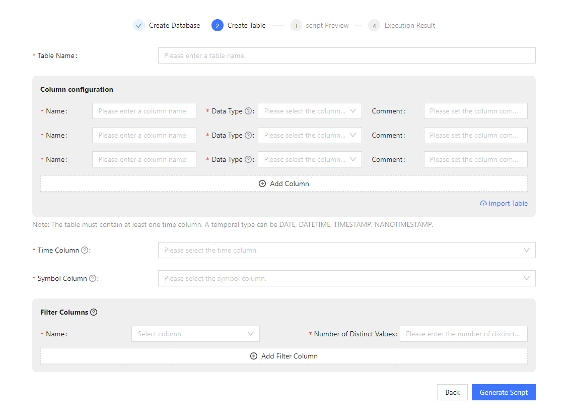 The following two images show the Create Table pages for Using Existing Database and Creating New Database. Most of the information on both pages is the same. The difference is that when creating a table under an existing database, the Filter Columns will be displayed at the bottom of the page. When creating a new database table, users need to select the time column and the symbol column (this column is displayed only if the daily increment exceeds 1 million rows) as partitioning columns.