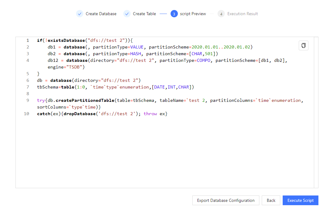 In financial scenarios, many factors (such as daily increments, etc.) can affect the parameter settings when creating databases and tables. This page includes common factors to help users configure parameters based on their needs, ensuring the creation of suitable databases and tables. The creation of databases and tables includes the following four steps: Create Database, Create Table, Script Preview and Execution Result.