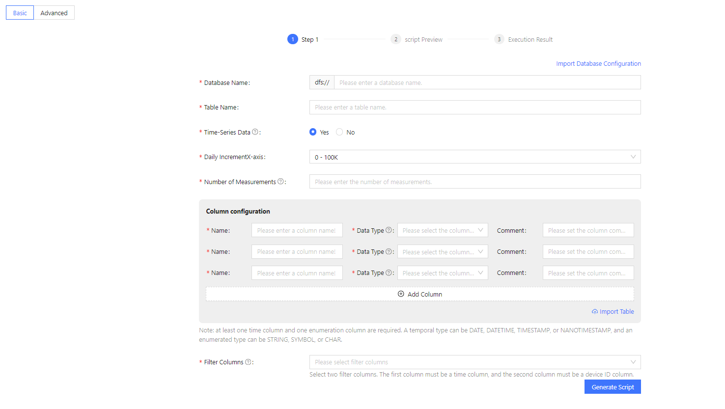 IoT data includes characteristics such as the number of measurements, acquisition frequency, and daily incrementX-axis. These data are usually stored in TSDB databases for efficient storage and query. Most of the features on the Guide for IoT Scenario are the same as those on the Guide for Financial Scenario. However, it offers two types of table creation pages based on the user's familiarity with the database: a basic version and an advanced version.