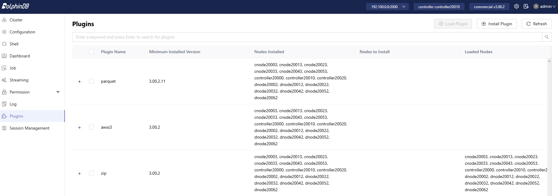Through the plugin management interface, administrators can centrally manage plugins across all nodes in the cluster. This includes viewing plugin versions, one-click installation and loading of plugins to ensure consistency between the version of DolphinDB server and plugin versions deployed on each node. This helps avoid issues caused by version mismatches between nodes.