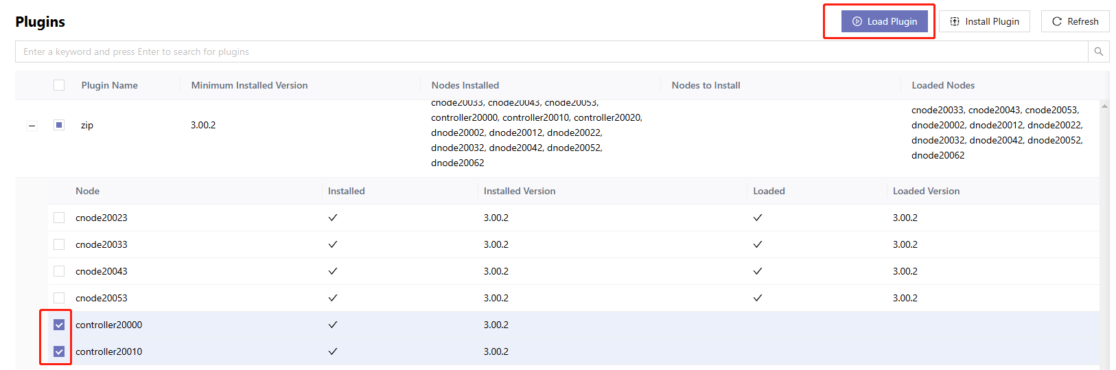 To load a plugin on all nodes that have installed it, select the target plugin and click Load Plugin in the top-right corner.