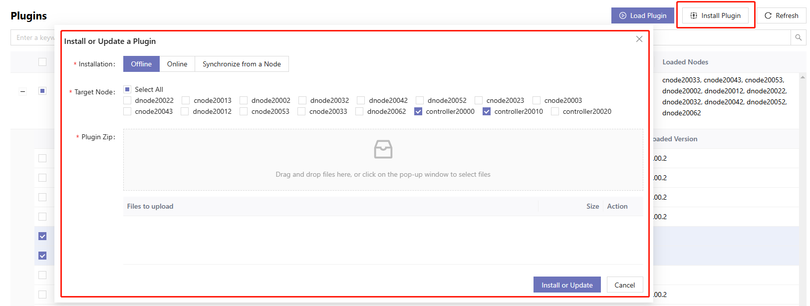 In the pop-up window, select Synchronize from a Node, choose the plugin to install/update, the target node, and the source node, then click Install or Update.