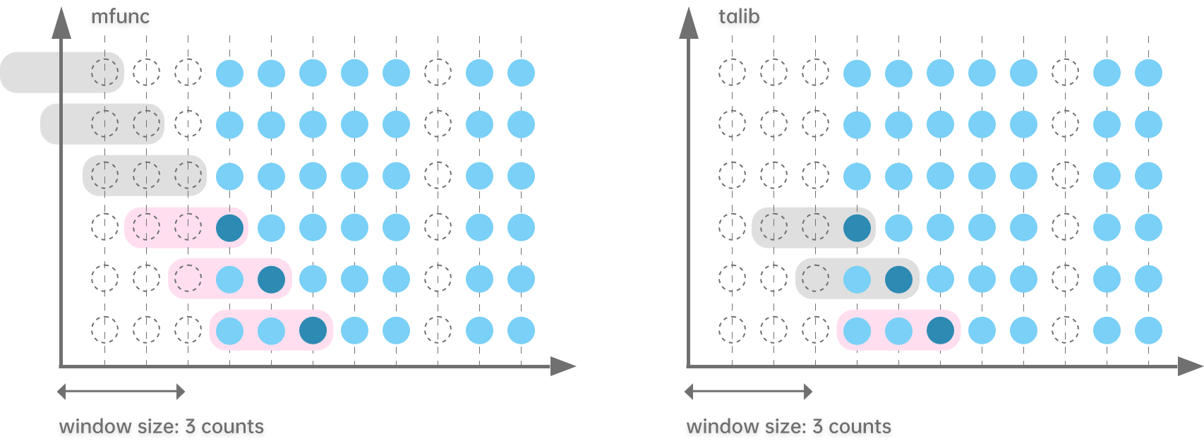 Different from other DolphinDB window functions, TA-lib functions keep the null values at the beginning of data in the output. The calculation in the sliding window starts from the first non-null value.