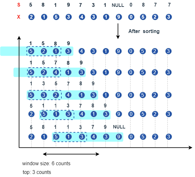 In the following figure, the elements of X are sorted based on S in ascending order in a sliding window of length 6, and the first 3 elements are selected for calculation. For the first top windows, all the elements are taken for calculation. Therefore, the figure illustrates the rules starting from the top + 1 window.