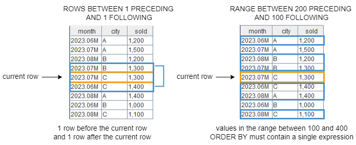 ROWS | RANGE UNBOUNDED PRECEDINGis equal toROWS | RANGE BETWEEN UNBOUNDED PRECEDING AND CURRENT ROW. -