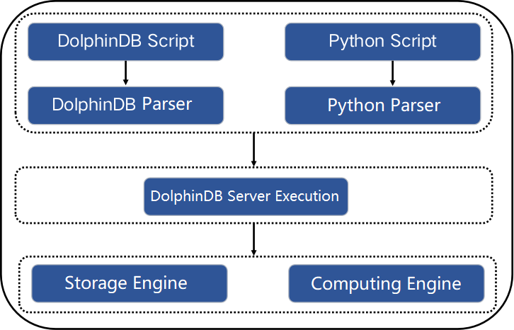 DolphinDB Python Parser interprets Python language and provides an execution environment for Python scripts. Unlike conventional Python, it is unrestricted by Global Interpreter Lock (GIL), unleashing the full potential of multi-core and distributed computing. By sharing the object system and runtime environment with DolphinDB scripts, Python Parser can directly access DolphinDB's storage engines and apply its built-in computing engine. Additionally, pandas, a third-party library for Python Parser, has been implemented. The following diagram briefly shows the structure of the script parsing system of DolphinDB.