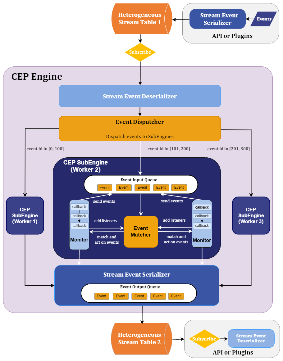 CEP Engine: Receives the latest event data in real-time by subscribing to the heterogeneous stream table. The CEP engine will implement event matching logic and act on selected events. The CEP engine can generate multiple sub-engines for parallel processing of events. Each sub-engine consists of: