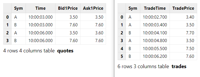 - The "quotes.Time" specified in the parameter metrics indicates the column "Time" in the "quotes" table is taken as the time column in the output table. Since the "trades" table also contains a "Time" column, if "Time" is specified without a prefix, the output takes the column from the left table by default.