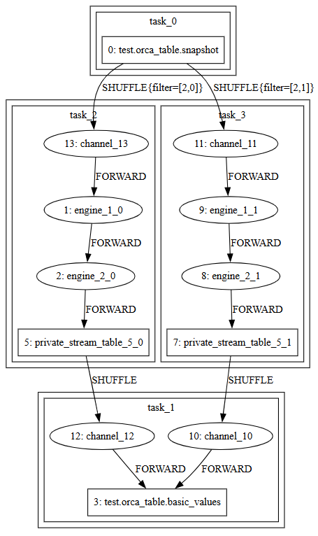 - If the parallelism levels of upstream and downstream nodes differ, a stream table is inserted to collect upstream data and redistribute it according to the downstream parallelism. This redistribution process is referred to as a shuffle.