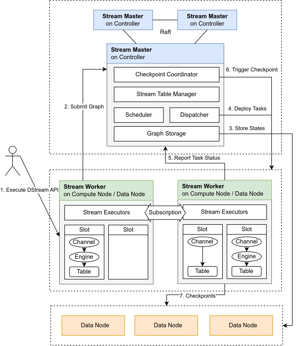 - The Stream Master receives the logical stream graph, and generates the physical stream graph and scheduling plan based on the graph topology and current cluster resource status.