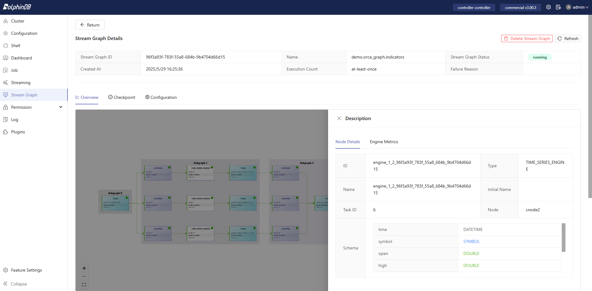 DolphinDB supports catalogs to organize various database objects, including distributed tables. Orca further extends the useage of catalogs by registering stream graphs, stream table, and engines into the catalog system. This allows users to access all types of objects in a unified manner.