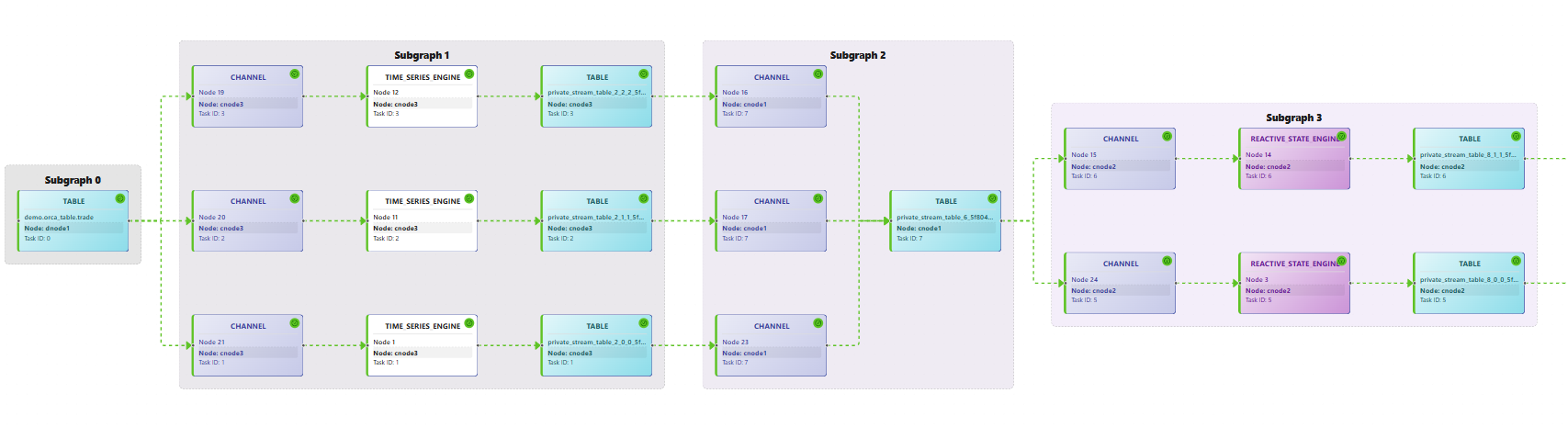 - Stream task generation: Within each subgraph, stream tasks are created based on the subgraph’s parallelism. A stream task is the basic unit of execution—it is dispatched to a single thread and consists of a sequential chain of engines and stream tables. Stream tasks communicate with each other by subscribing to upstream data. The total number of stream tasks determines the upper bound of thread usage in the system. Orca minimizes the number of tasks to maximize resource efficiency.