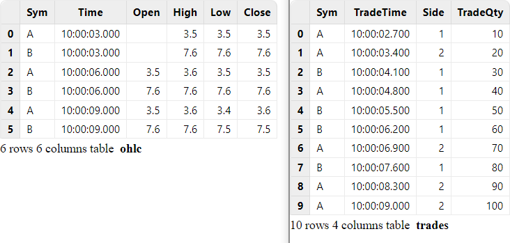 t2 = table(`A`A`B`A`B`B`A`B`A`A as Sym, 10:00:02.000+(1..10)*700 as TradeTime,  (1 2 1 1 1 1 2 1 2 2) as Side, (1..10) * 10 as TradeQty)