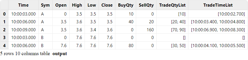 The output table is shown below. The last two columns use array vectors to display all values of column "TradeQty" and "TradeTime" within the window.