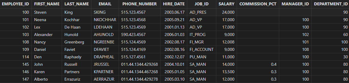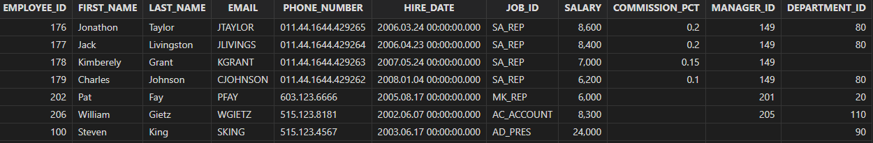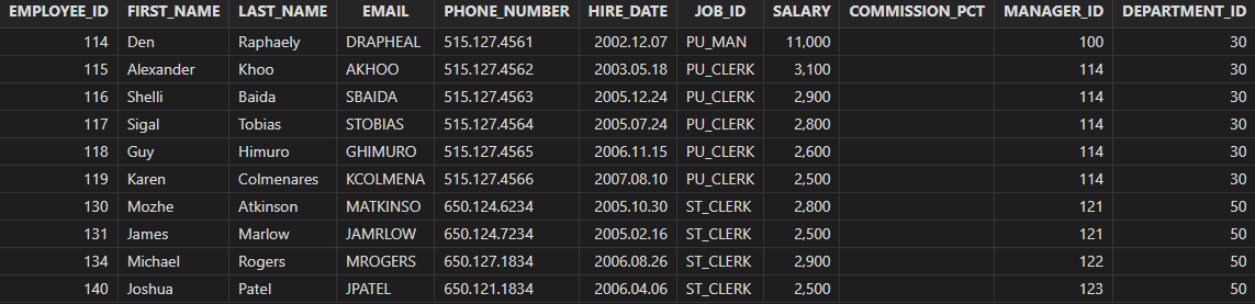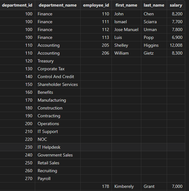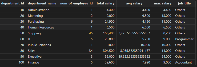 The following example queries information on employee salaries by department in Oracle mode, including department information, the number of employees, etc: