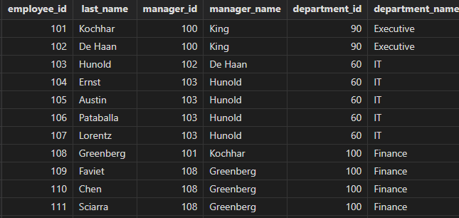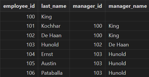 select a.employee_id, a.last_name, a.manager_id, b.last_name as manager_name
