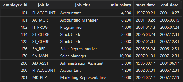 Query the job history of each employee. Both FI_ACCOUNT and AC_ACCOUNT are treated as AC_ACCOUNT (accountant).