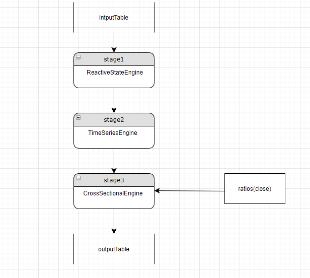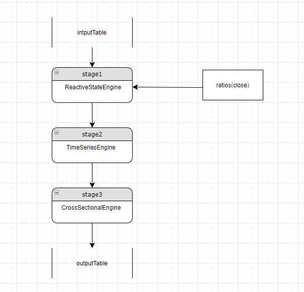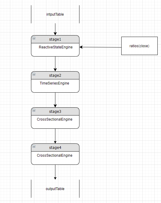 In this example, stage 3 is the current stage and uses a cross-sectional engine. But ratios(close) needs a reactive state engine. Since stage 1 already has a reactive state engine, the parser uses it to calculate ratios(close) and passes through the result to stage 3:
