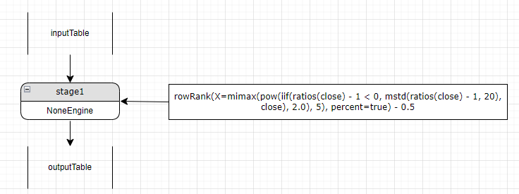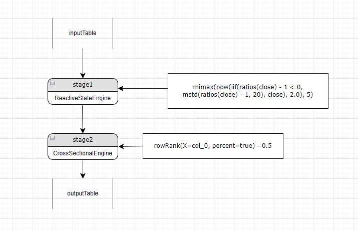 The first parameter, mimax, neither has a row prefix nor uses higher-order functions byrow or rolling. Therefore, it maps to a reactive state engine rather than the current cross-sectional engine. A new stage (stage1) with a reactive state engine is created before the cross-sectional engine (stage2). Stage1 now becomes the "current" stage.
