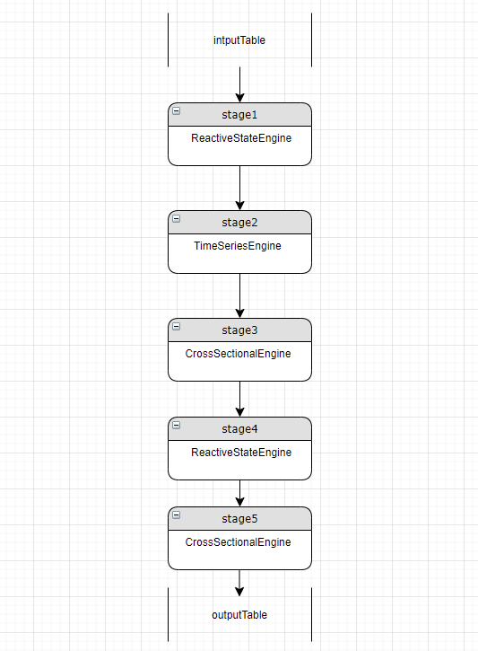 Each stage in a stream engine pipeline has an engine type, input table schema, and a list of the metrics for computation. The following example defines a Process class representing a stage in a stream engine pipeline: