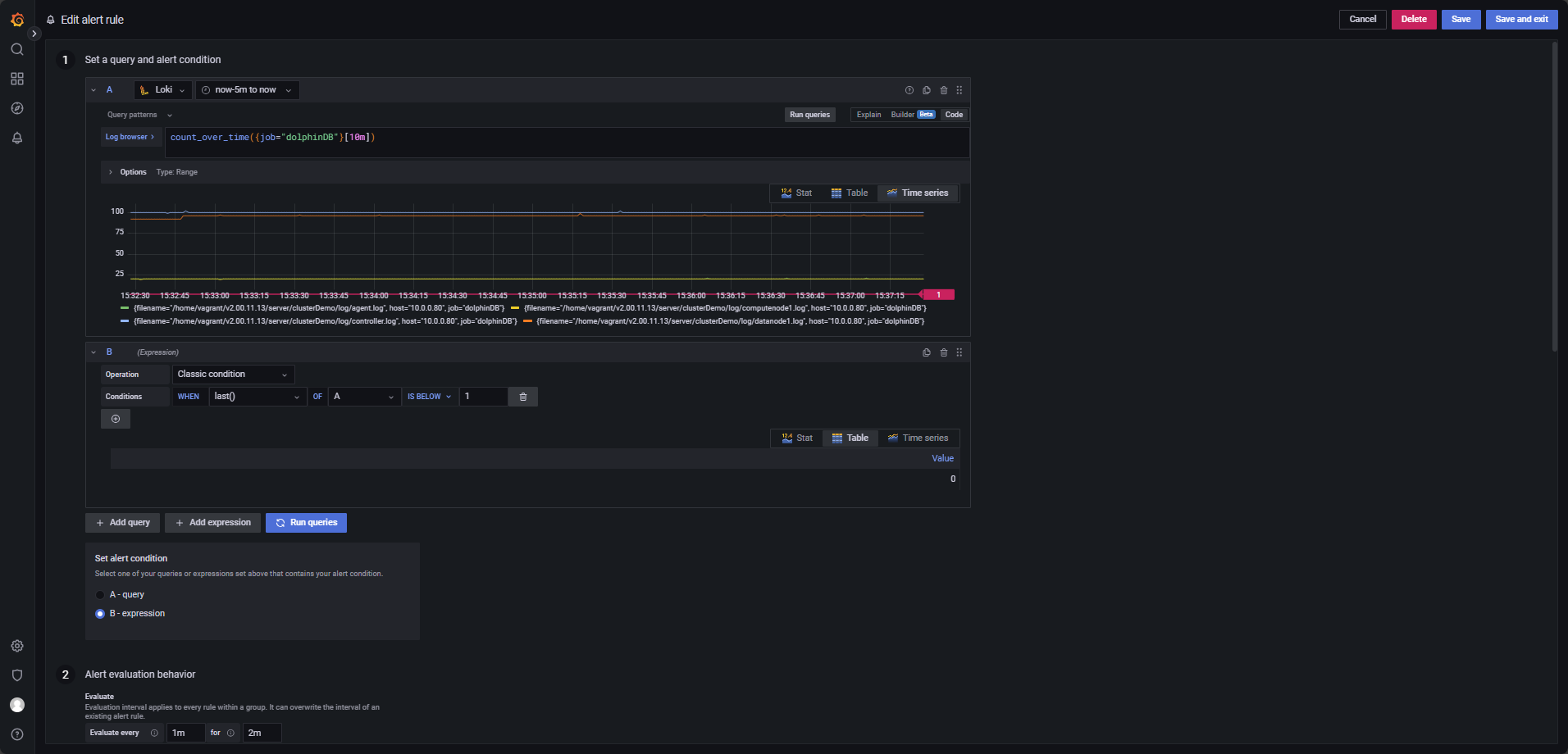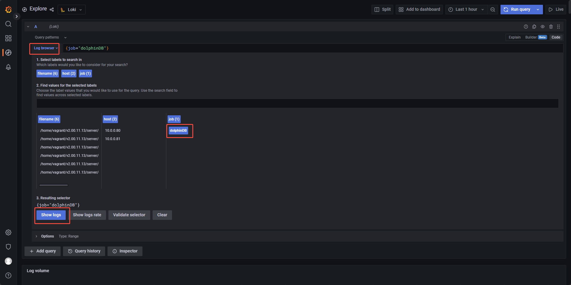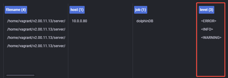 count_over_time({filename="/home/vagrant/v2.00.11.13/server/clusterDemo/log/agent.log",job="dolphinDB"}[10m]). This counts log entries for the specified file (agent.log) in the past 10 minutes.