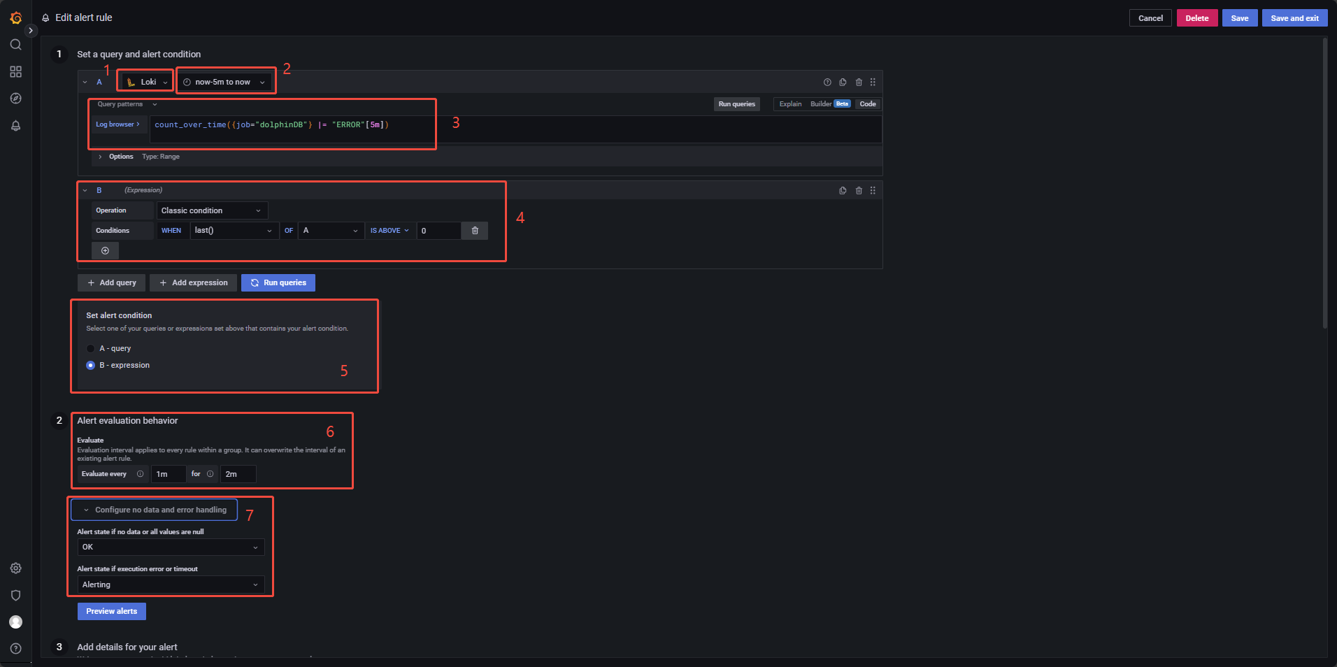 count_over_time({job="dolphinDB", level="ERROR"}[5m]). Be sure