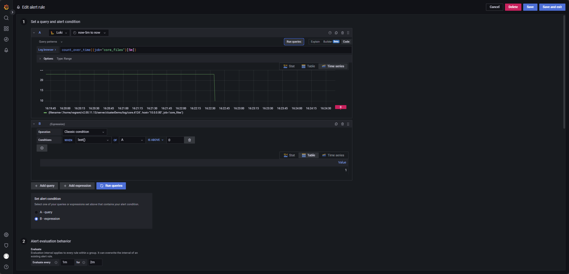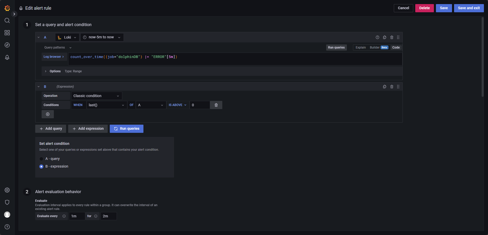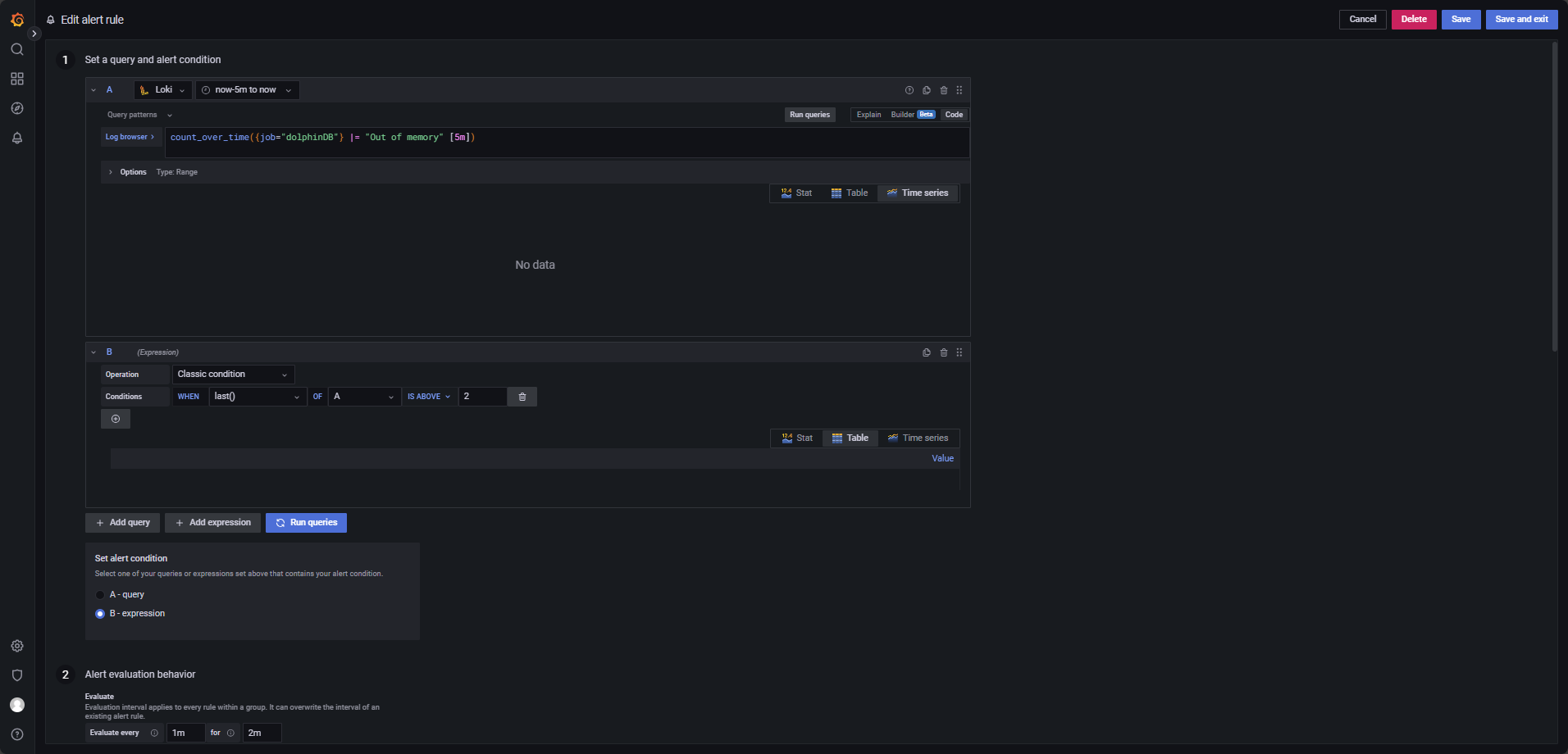The LogQL query is below, evaluated every 1 minute for 2 minutes, triggering when