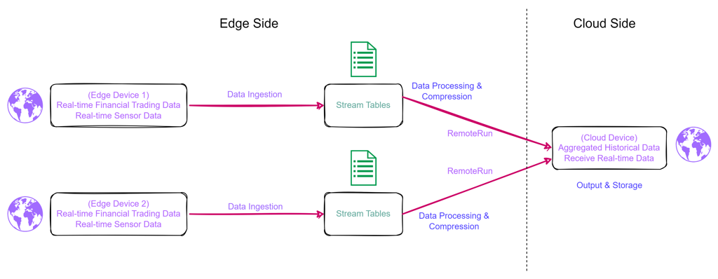 By leveraging stream tables for real-time data collection and distribution, and combining them with local subscription and remoteRun calls, the solution ensures low-latency, resource-efficient data synchronization. All compression, transmission, and function orchestration are handled on the edge side, allowing the cloud to maintain a lightweight processing load.