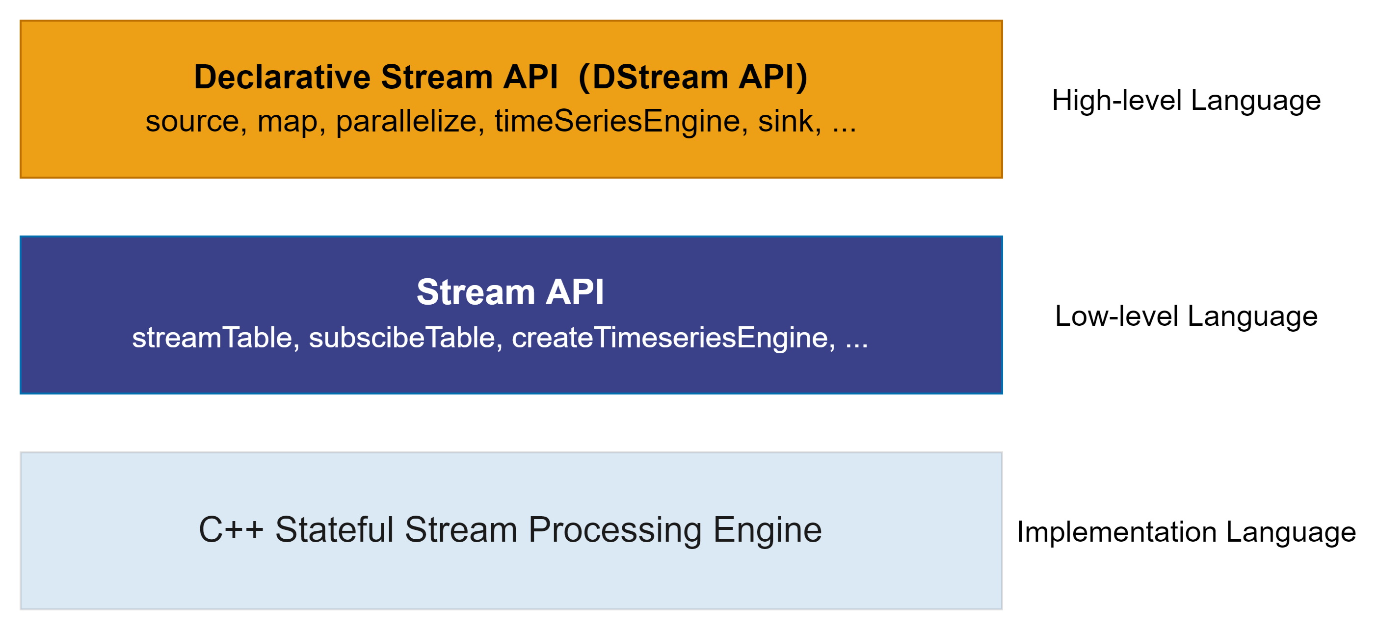 Before entering the DStream API cases in subsequent chapters, we will first review the several abstraction levels of DolphinDB stream computing programming in this chapter. This chapter is mainly for users who have used DolphinDB stream computing frameworks in versions prior to 3.00.3, intended to briefly introduce the relationship between DStream API and previously existing interfaces. Readers may also skip this chapter and directly follow subsequent chapters to learn DStream API usage.