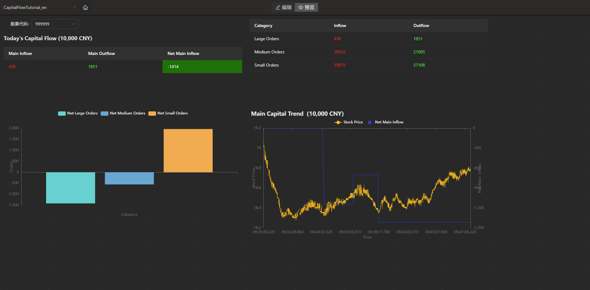 The data panel configuration based on capital flow data computed in this document produces the following effect. The corresponding JSON configuration file is provided in the appendix.