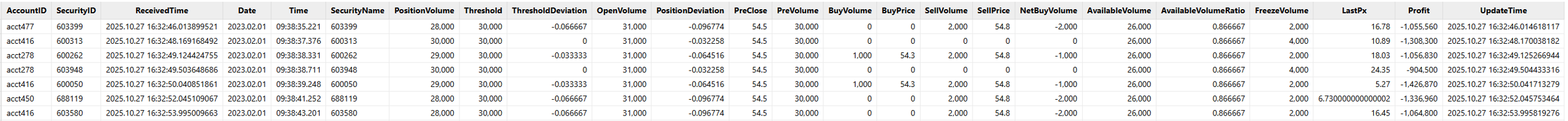 Sample data and import code are provided in the appendix. The sample data represents simulated data for half a trading day, in which the market data table simulates the order/fill data streams for 5 accounts holding 20 assets, the position information table simulates the position data for each asset held by these 5 accounts at market open, and the snapshot data includes L2 snapshot data for the 20 assets.