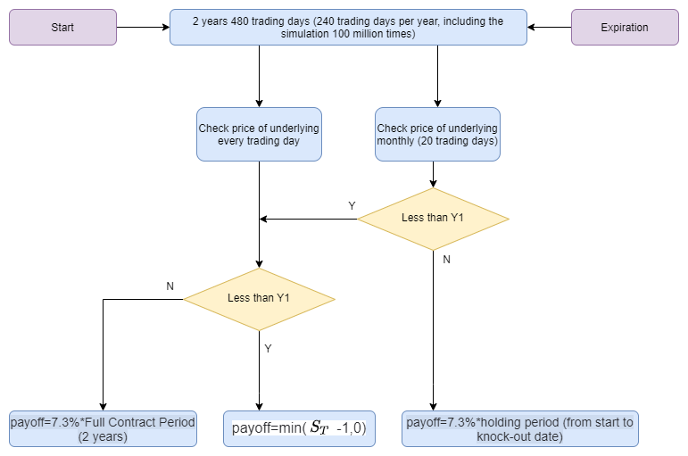 • If a knock-out event occurs on any observation day, the holder receives payoff=7.3%*holding period (from start to knock-out date).