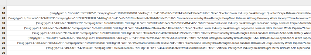 We use a JSONL-formatted news file as an example to demonstrate how to process, store, and utilize news data. In a JSONL file, each line is a JSON object representing an individual news record. A sample line in our tutorial: