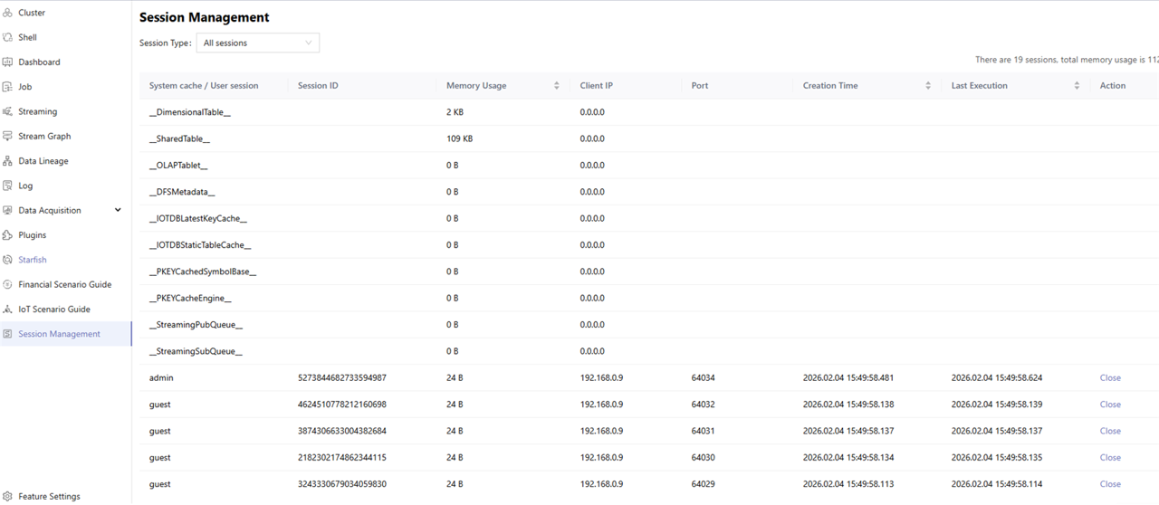 You can view the session information for the current node via the Session Management, including system cache and user sessions. The Controller can view sessions for all nodes.