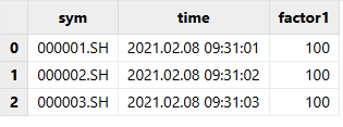 data = table(take(["000001.SH","000002.SH","000003.SH"], 3) as sym, take(2021.02.08T09:31:00 + 1..3, 3) as time, take(100.0, 3) as price)