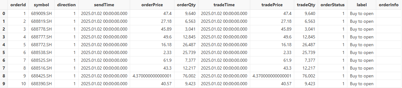 After the backtest is completed, users can obtain daily positions, daily equity, return overview, transaction details, and user-defined logic context in the strategy through corresponding interfaces. The following figure shows the transaction detail results obtained in this example: