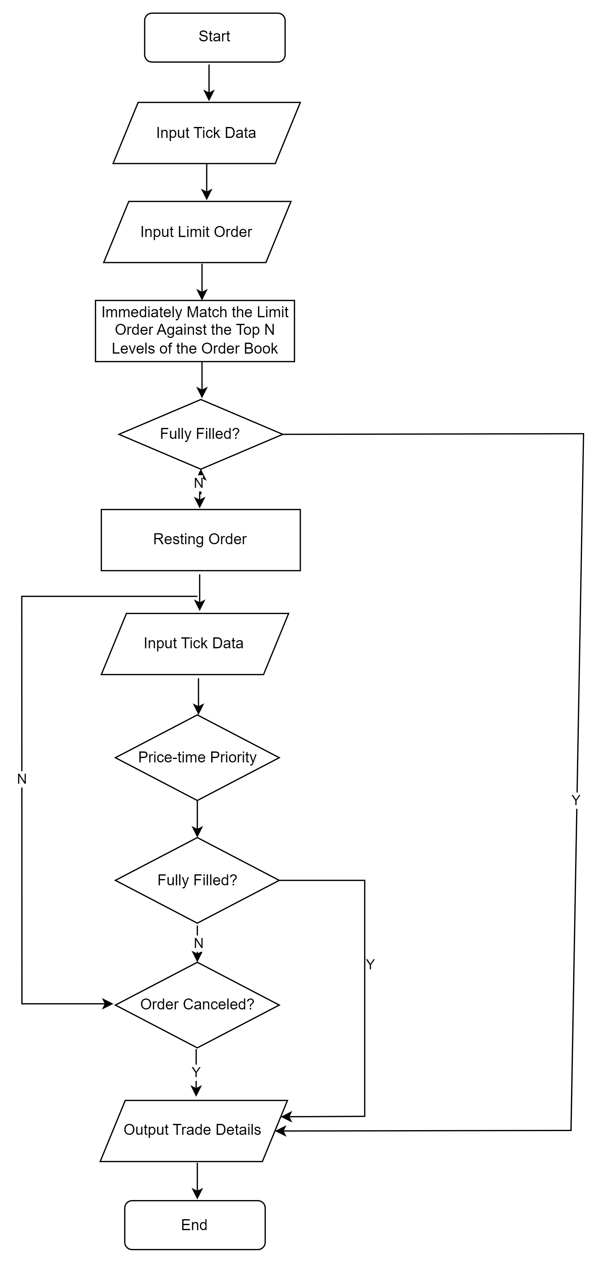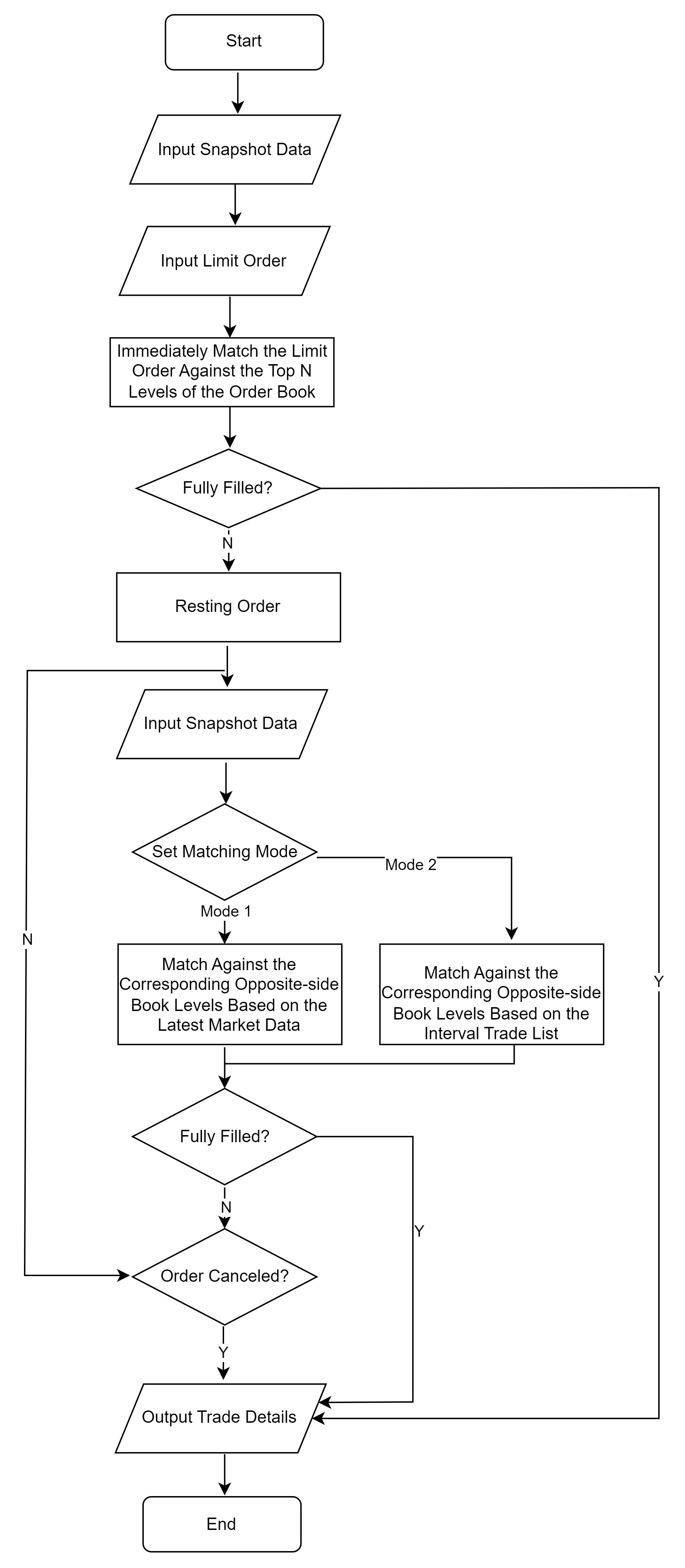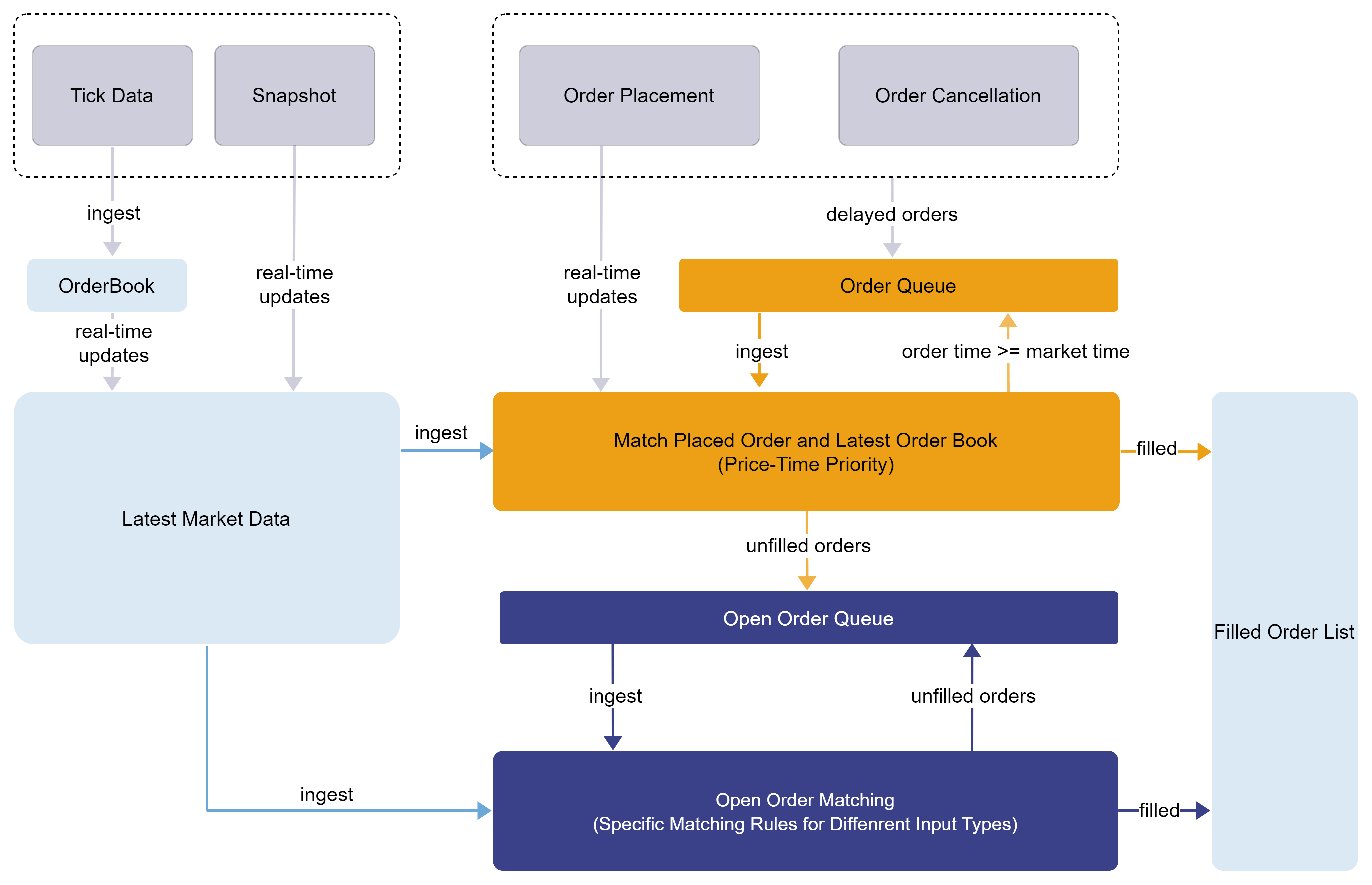 The order matching simulator takes two inputs: the market data and the orders placed by the user. It simulates order matching according to the configured matching rules. Execution results are written to the trade details output table, including partial fills, order rejections, and order cancellations. Any unfilled portion remains pending for subsequent matching or cancellation.