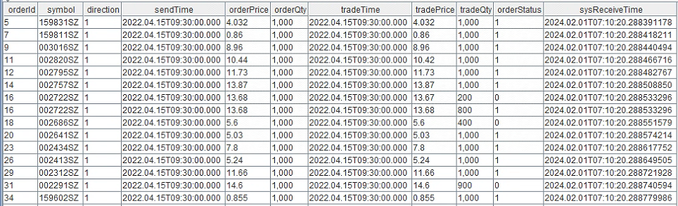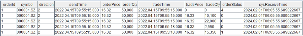 The trade details output table (tradeOutputTable) stores the execution results of orders written by the engine. You can define the table in the following order (the table name can be changed, but the column types and their order must remain unchanged, as each column has a specific meaning.