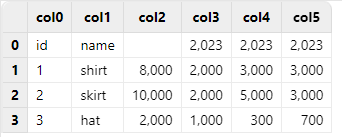 | 2 | skirt | 10000 | 2000 | 5000 | 3000 |
