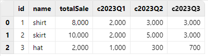 | id | name | totalSale | 2023Q1 | 2023Q2 | 2023Q3 |