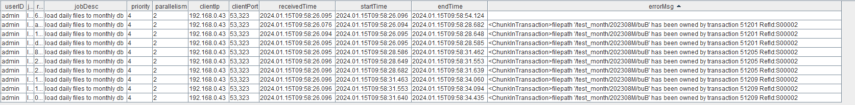 submitJob("loadCSVTest", "load daily files to monthly db", loadTextEx, database("dfs://test_month"), "data", "date", filePath+i)