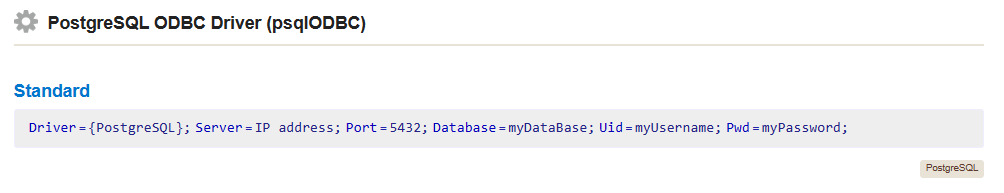 Refer to the Connection String Reference for the standard ODBC connection string format for PostgreSQL: